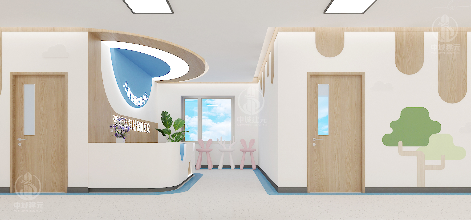 踏入门诊大厅的瞬间,温暖便扑面而来。柔和的米杏色墙面搭配温润的原木装饰,取代了刺眼的白与冰冷的金属;顶部的漫射灯光模拟清晨第一缕阳光,驱散就诊时的不安。等候区的软包沙发自带包裹感,身旁的“小太阳游乐角”是孩子们的快乐天地——圆润防撞的绘本架、色彩明快的益智玩具、墙面灵动的森林手绘,让等候时光变成亲子互动的温馨时刻。弧形导诊台笑意相迎,暖粉色医护制服传递亲和力,小脚印造型的地面指引、清晰明了的电子导诊屏,让每一次就诊都方向明确、从容不迫。