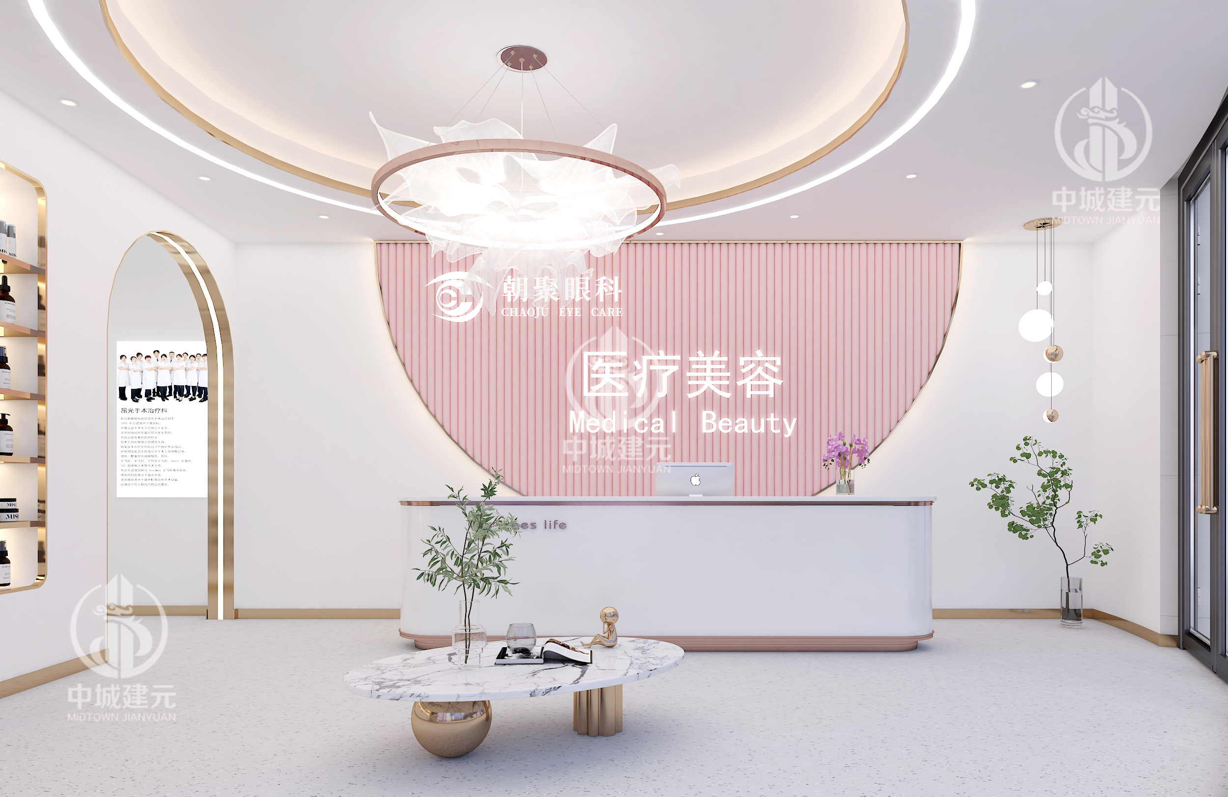 踏入前厅的瞬间,紧绷的神经便该被温柔化解。摒弃浮夸的装饰与刺眼的色彩,我们以低饱和度的奶白、粉色为基底,搭配温润的软包与细腻的肌理,构建出兼具呼吸感与质感的视觉场域。接待台没有传统医疗空间的冰冷隔阂,圆弧转角的设计自带亲和力,背景墙嵌入极简的品牌标识与柔和的线性灯光,既传递出专业性,又避免了距离感。一旁的等候区并非简单的座椅陈列,而是以“家庭客厅”为灵感,设置模块化的柔软沙发、随手可及的美学杂志与香薰加湿器,淡雅的雪松香气弥漫其间,让等待的时光成为一场沉浸式的放松序曲。